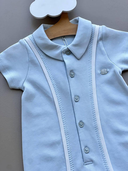 Introducing our Polo Organic Cotton Summer Romper for boys! Made with 100% organic cotton, this romper is perfect for the summer season. The blue and white design adds a touch of style to the overall look. Give your little one the comfort and breathability of organic cotton this summer.